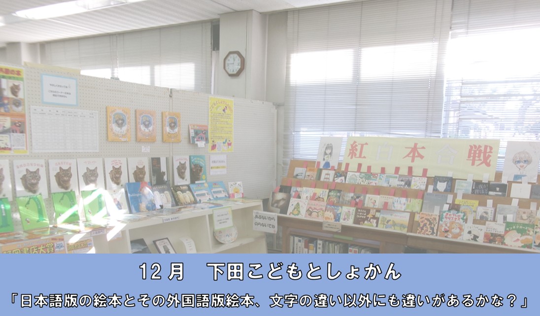 下田こどもとしょかんに寄贈された本や所蔵された本を展示します。